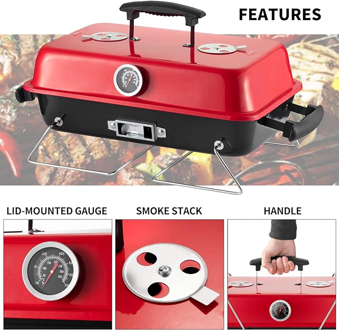 Portable Charcoal Grill, Tabletop Outdoor Barbecue Smoker, Small BBQ Grill for Outdoor Cooking Backyard Camping Picnics Beach,RED
