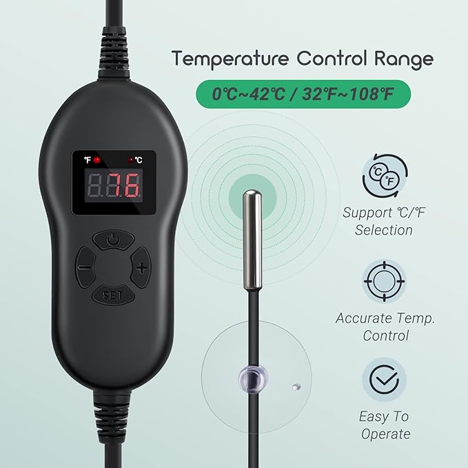 - Easy To Use: No hassle, no confusion, the attached heating mat controller is easy to operate, and we can use the NTC probe to view the soil temperature at any time to ensure our plants are in a comfortable environment.