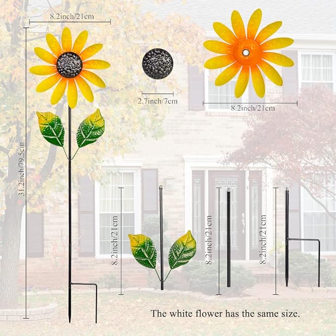 - Decorative PinWheel:You will get 2 pack flower pinwheels with garden stakes, the yellow flower and white flower meshes well with the green leaves, these bright colors make your garden more attractive and eye-catching