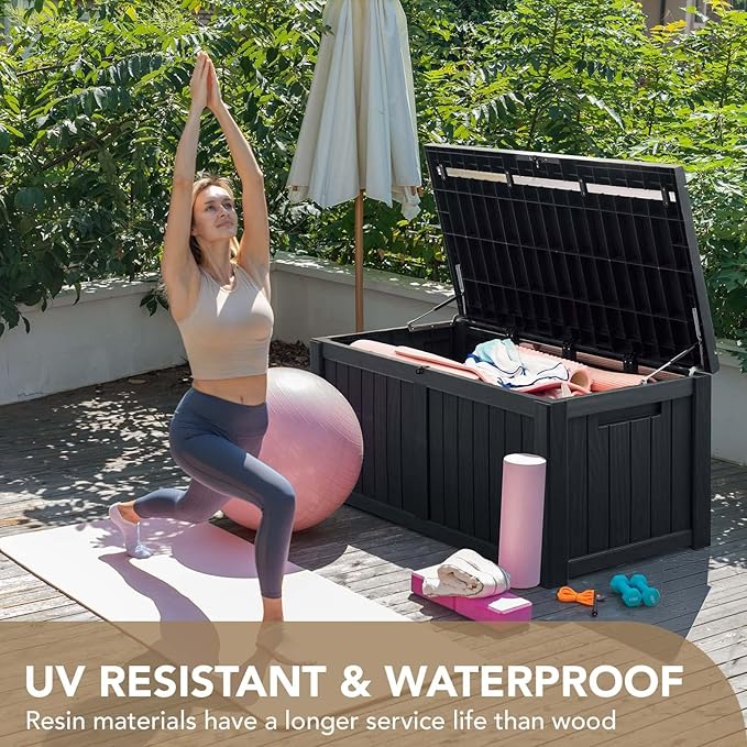 - Resin Material : The main body of deck storage box is made of resin material, which has a longer service life, and better UV protection and waterproof performance than wood or rattan. It can be placed anywhere you want, such as on the deck, by the sink, on the porch, in the garden.