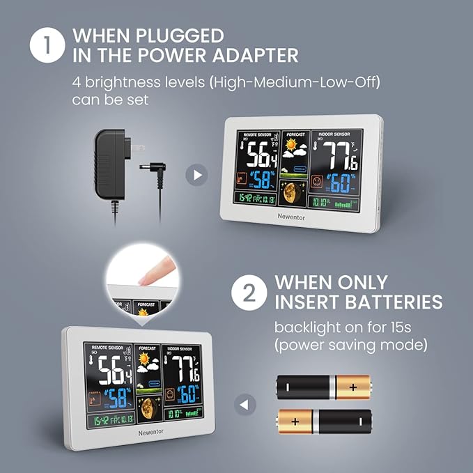 - [7.5in Large Colorful Display with Adjustable Backlight] When only insert batteries(2 X AA battery, not included), this weather clock enters the power saving mode and the backlight is on for 15S. When plugged in the power adapter, 4 levels of backlight(strong-medium-low-dim) can be adjusted (when searching for WWVB signals, to avoid some interference factors, the screen goes blank for 7 minutes).