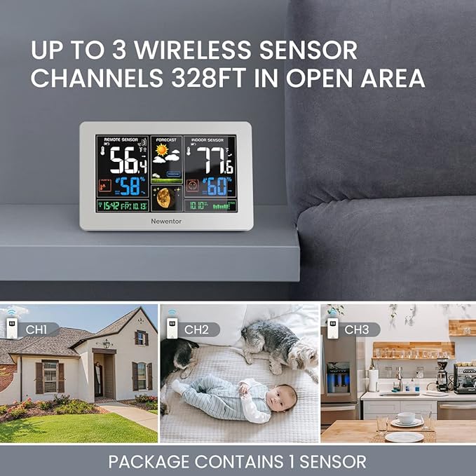 - [Indoor Outdoor Thermometer with 3 Remote Channel] This indoor outdoor thermometer can connect up to 3 sensors, you can easily detect the bedroom, basement, warehouse, garage, outdoor weather conditions, etc. Package contains 1 sensor.