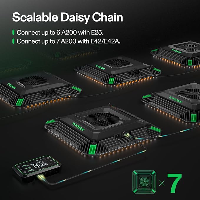 - Integrated Circulation Fan: The centrally located circulation fan in the LED balances airflow where other fans cannot reach, allowing more air to enter the canopy directly and balancing temp and humidity; To unlock additional features, the fan must be used with the Vivosun Growhub Controller (E42A/E25), available for separate purchase