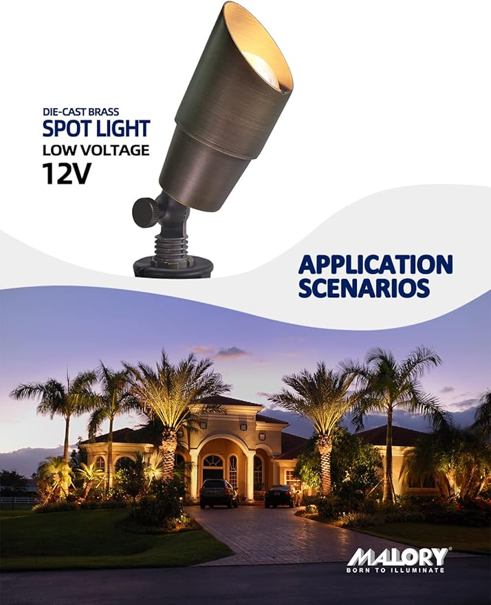 - BRASS LIGHT FIXTURE:MALORY landscape spotlight is constructed of die-cast brass for durability and beauty.Brass spot light doesn't corrode,more durable and reliable than aluminum and plastic fixtures,ideal for any uplighting application.Simple design structure for the light fixture make it looks beautiful yet unobtrusive in any landscape,suitable for decorating most houses and yards.