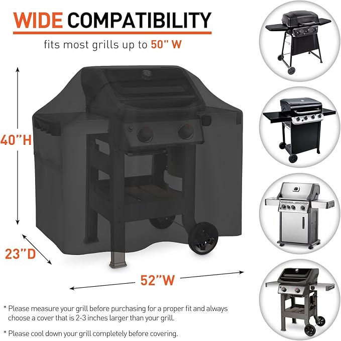 - 【Wide Compatibility】- The grill cover measures 52" W x 23" D x 40" H, fits most outdoor grills with 2 - 3 burners from 48" to 50" wide, such as popular grill brands Weber, Charbroil, Nexgrill, Napoleon, Holland, Kenmore, Jenn Air, etc. Please be sure to measure your grill before purchasing.