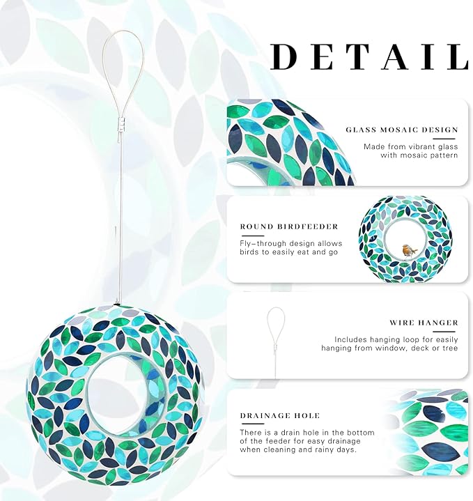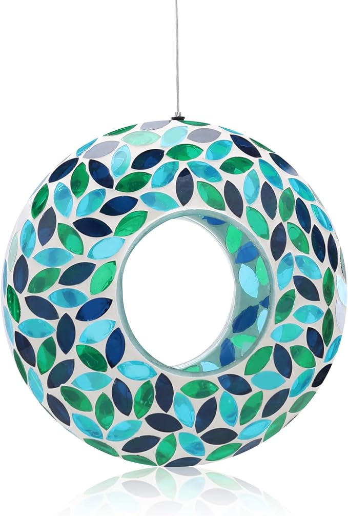 - 【Mosaic Design】This round mosaic bird feeder with a hanging wire so you can easily hang the feeder outside to brighten up your backyard, patio, lawn, deck, or balcony. It catches sunlight as it gently spins and sparkles. Size: 10 x 10 x 4 inches