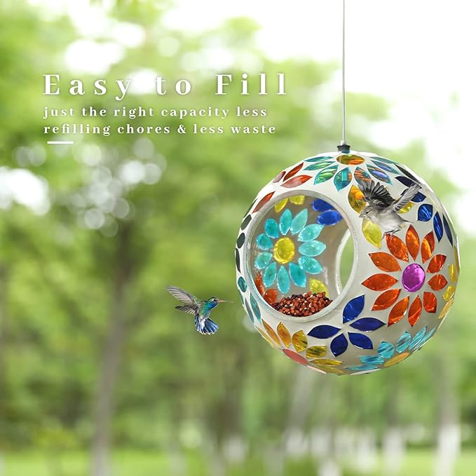 VCUTEKA Bird Feeder Mosaic Fly Through Bird Feeders for Outside Hanging with Round Shape Glass Container to Attract More Wild Birds for Garden, Yard, Backyard, Deck and Porch Decor, 7-Inch