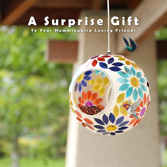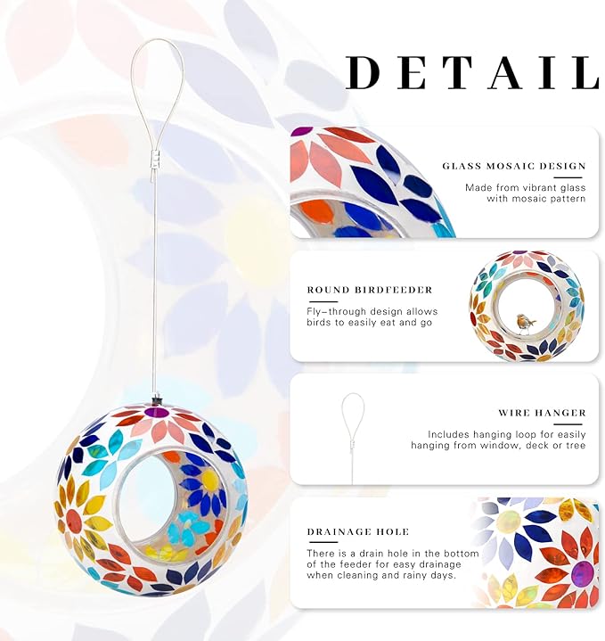 - 【Mosaic Design】This round mosaic bird feeder with a hanging wire so you can easily hang the feeder outside to brighten up your backyard, patio, lawn, deck, or balcony. It catches sunlight as it gently spins and sparkles. Size: 7 x 7 x 3.5 inches