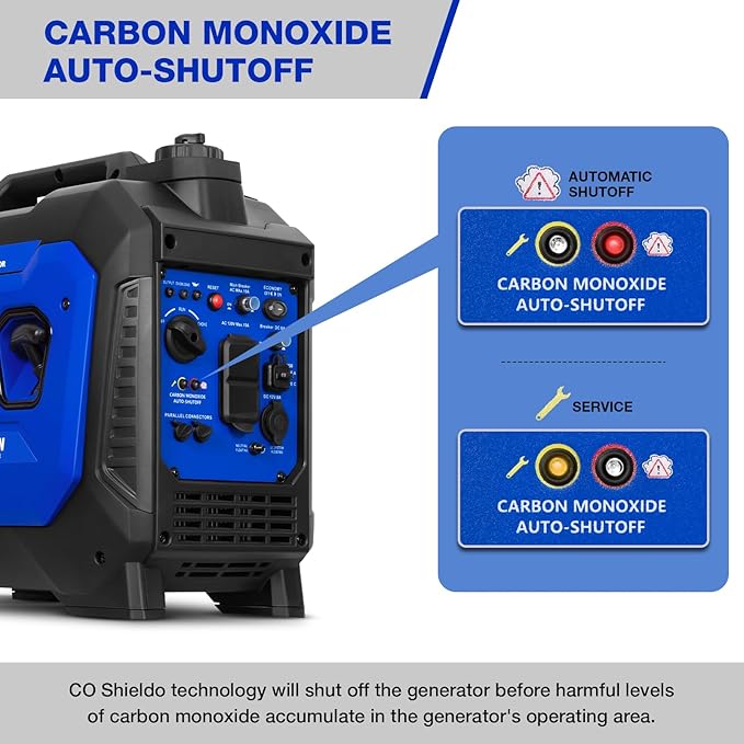 - CO Sensor: The generator will automatically shuts down the generator if dangerous carbon monoxide levels are detected. Please use it in a ventilated place.