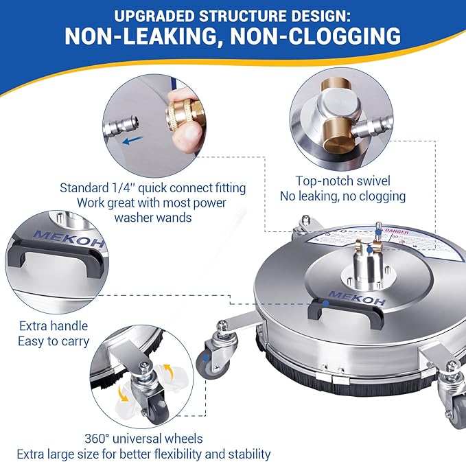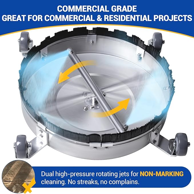 - Non-leaking, Non-clogging: Crafted from high-quality stainless steel, this power washer surface cleaner ensures exceptional durability and longevity, even under heavy use. The upgraded swivel of this power washer attachment is greased in advance and fully sealed, its sturdy build guarantees reliable performance, no leaking, no clogging, making it a dependable companion for all your pressure washing tasks