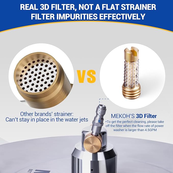 - Advanced 3D Filter & Convenient Handle: Unlike flat strainers that struggle to stay in place under high-pressure water jets, this pressure washer attachment features innovative 3D filter. This unique filter stays securely in place, preventing debris from clogging the nozzles and maintaining consistent cleaning efficiency throughout the task. This concrete cleaner also comes equipped with a sturdy handle, making it highly portable and easy to carry. Ideal for outdoor cleaning jobs
