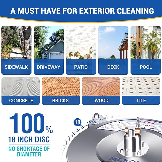 - Streak-Free Cleaning for Impeccable Results: MEKOH 18 inch pressure washer surface cleaner is designed to deliver powerful and efficient cleaning performance. With a maximum pressure of 4500 PSI and a flow rate of 4 GPM, it effortlessly removes dirt, grime, and stains from driveways, sidewalks, decks, and concrete surfaces, saving you valuable time and effort. Leave no streaks on the floors, achieving spotless surfaces with every use, enhancing the overall appearance of your property