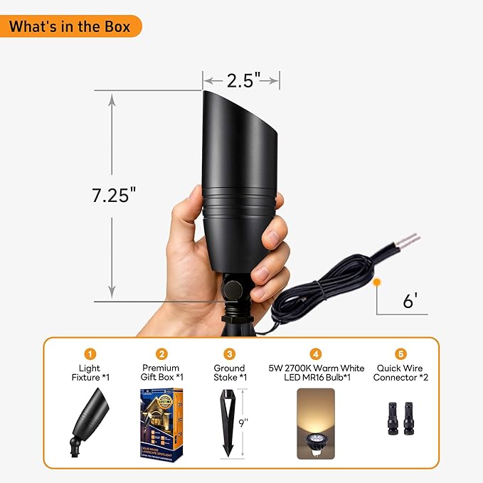 - ๐๐ซ๐ข๐ ๐ก๐ญ: Outdoor spotlight with a 5 watt LED MR16 bulb (450lm). Lights up exterior trees, walls, flags, and fountains up to 10-12 ft. 180ยฐ adjustable while the ground stake stays in place