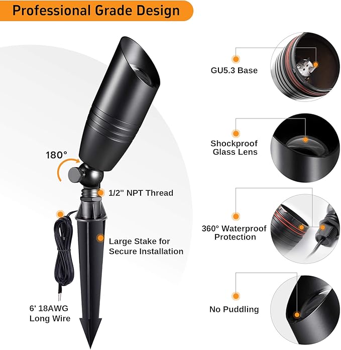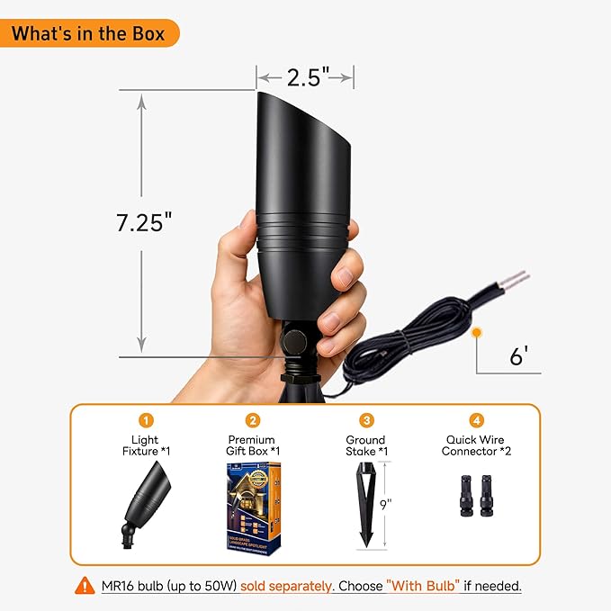 - ๐๐ซ๐ข๐ ๐ก๐ญ: Outdoor spotlights that use MR16 LED bulbs (sold separately) and support up to 50W for powerful illumination. Lights up exterior trees, walls, flags, and fountains. 180ยฐ adjustable while the ground stake stays in place