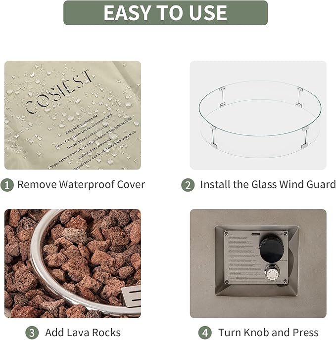 - 🔥 【 Fireplace-in-the-round】: It's like having a fireplace wherever you want it! The low profile of this elegant fire table just beckons you to gather round it and tell stories. Clean burning propane flame provides soothing warmth with electronic ignition, safety valve for easy start, gentle lighting and a centerpiece for many outdoor evenings worth remembering.