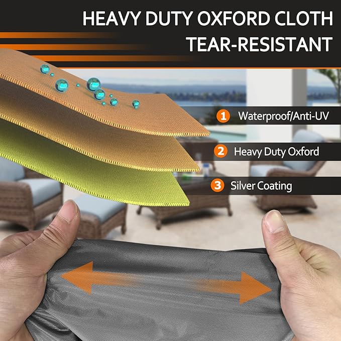 - 【Durable Fabric for All-Season Protector】Lawn chair covers are made of high density 500D heavy duty Oxford cloth, has great tear-resistant and UV-resistant. Protect your outdoor chairs safe from rain, snow, dirt, uv and other outdoor elements all year round.