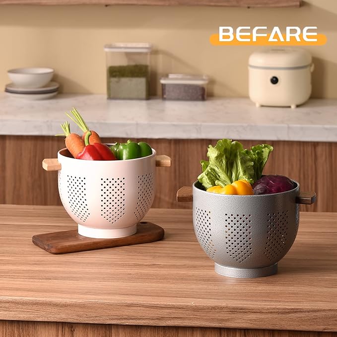 Metal Colander with Wood Handle and Stable Base, Powder Coated Steel Kitchen Strainer Basket for Draining Pasta, Vegetable and fruit(5.5quart,Greyhammertone)