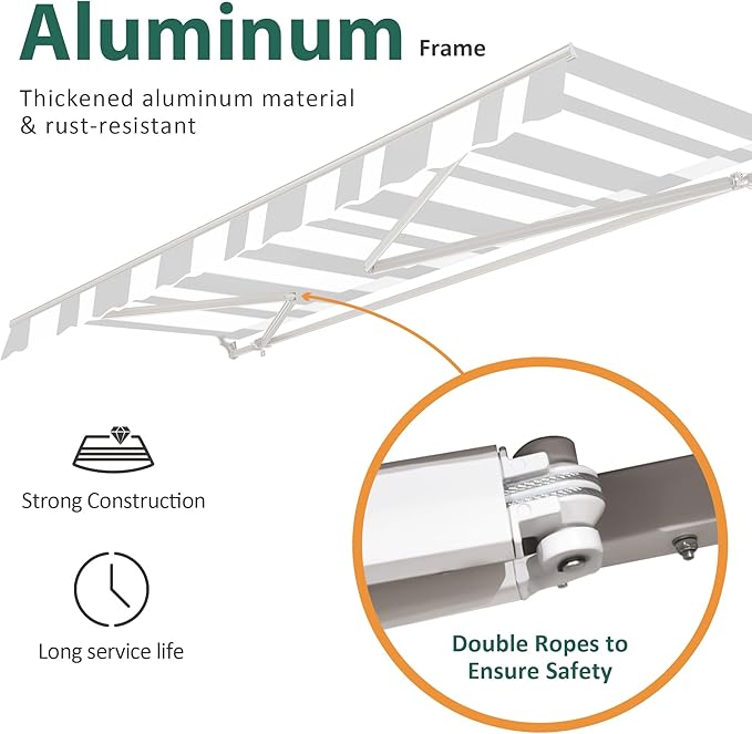 - Solid Structure : With a combination frame composed of powder-coated steel tubes and aluminum, our deck awning has the strength needed to endure water, wind, and weather. (Please use caution when a large storm occurs).