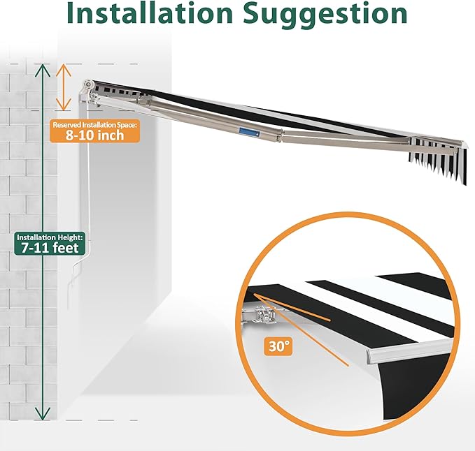 - Adjustable And Retractable Awning : During installation, you can customize the sunshade coverage, and the awning of the patio has an adjustment range of 60°-90°. In addition, just turn the 4.9' hand crank to extend the retractable awning to your desired position to meet your sunshade and rain protection needs.