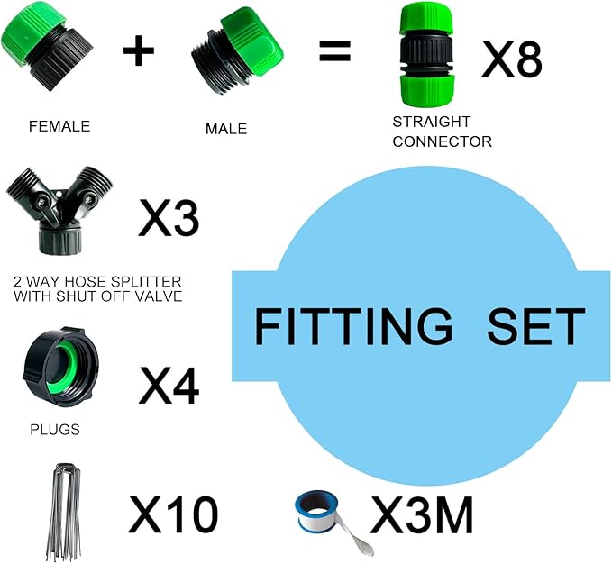 - Amrita Soaker Hose & PVC Garden hose ; Package Include:1/2" soaker hose*60ft, 1/2" PVC garden hose *50ft, ( Male+female )connector*8, 2 Way hose splitter with shut off valve*3, Garden stakes*10, Seal tap*1