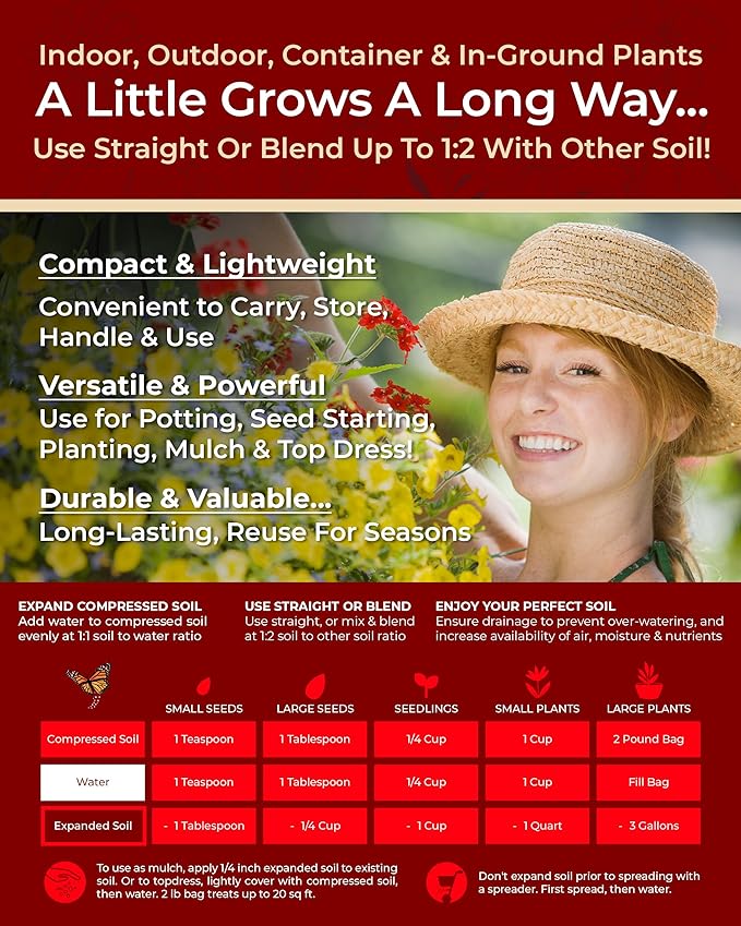 - A LITTLE DOES A LOT - Easy to use compressed soil granules quickly expand up to 4X and make up to 3 gallons of soil. Light, compact, easy to carry, resealable bag saves space.