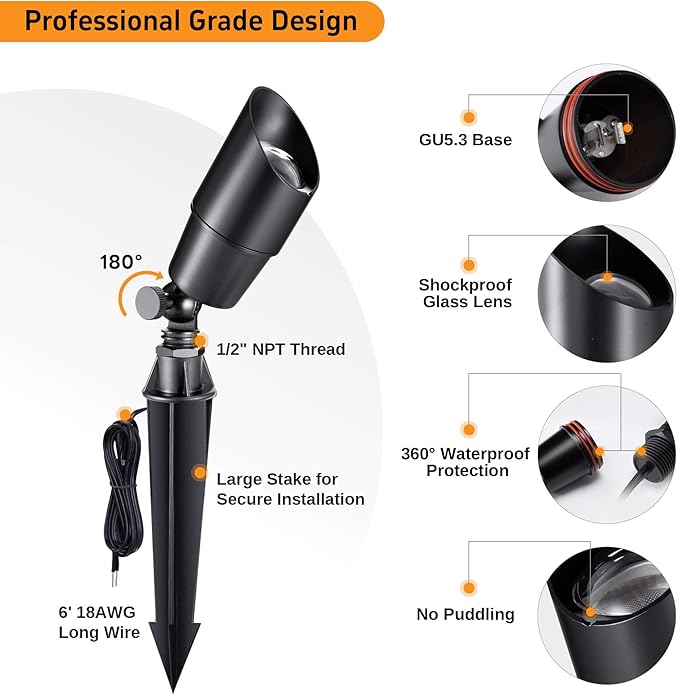 - ๐๐ซ๐ข๐ ๐ก๐ญ: Small outdoor spotlights that use MR16 LED bulbs (sold separately) and support up to 50W for powerful illumination. Lights up exterior trees, walls, flags, and fountains. 180ยฐ adjustable while the ground stake stays in place