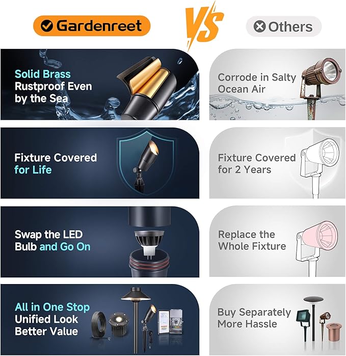 - ๐๐๐๐ฏ๐ฒ-๐๐ฎ๐ญ๐ฒ ๐๐จ๐ฅ๐ข๐ ๐๐ซ๐๐ฌ๐ฌ: Gardenreet wired landscape lighting wonโt rustโeven in salty, humid air like CA or FL. Lasts over 10 times longer than aluminum. A top pick among outdoor dรฉcor influencers. Give your yard a designerโs touch. Fixture and bulb covered for life