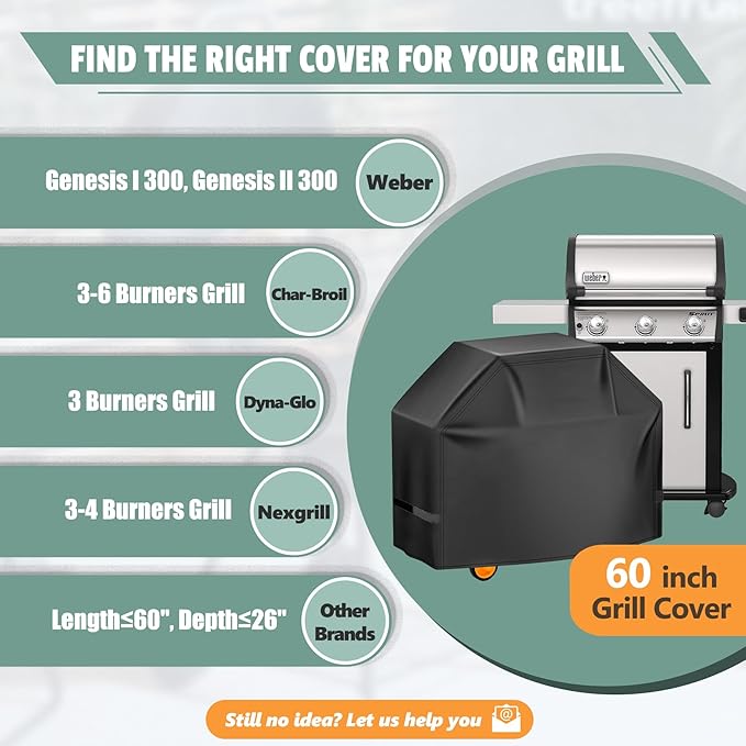 - [ Super Heavy-duty 60 Inch Grill Cover ] - Made of 600D premium oxford cloth with thickened soft coating, HomWanna BBQ grill covers are super durable but light weight. Measure: 60"W x 26"D x 44"H, this 60 inch grill cover will perfectly fit Weber Genesis 300 series gas grills, including: Weber Genesis ii e310, Genesis e320, Genesis e330, Genesis e335, s340 and Genesis Silver. Also fit 3 to 5 burners bbq grills from Dyna-Glo, Nexgrill, Brinkmann and Monument.