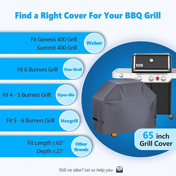 - [ Super Heavy-duty 65 Inch Grill Cover ] - Made of 600D premium oxford cloth with thickened soft coating, HomWanna BBQ grill covers are super durable but light weight. Measure: 66"W x 27"D x 46"H, this 65 inch grill cover will perfectly fit Weber Genesis 400 and Summit 400 series gas grills, including: Weber Genesis ii e325, e410, s435, s440 and Weber Summit e420, e450, e430, e450. Also fit 4 to 6 burners bbq grills from Dyna-Glo, Nexgrill, Brinkmann and Monument.
