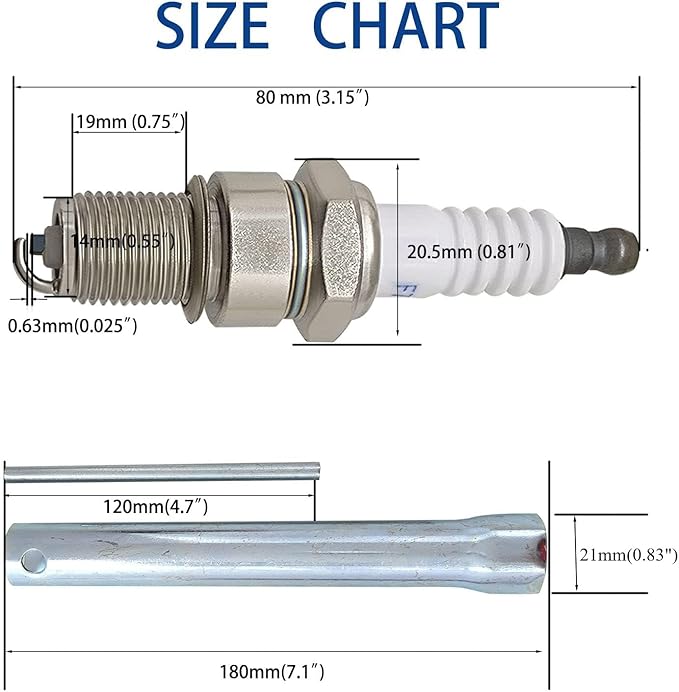 - 【A GREAT KIT & SIZE】Kit includes:3xF7TC Spark Plugs,1xSparkplug Wrench.a value for money set to meet your daily needs.Spark Plug Thread Diameter:14mm(0.55"),Thread Length:19mm (0.75"),Hex Size:20.5mm (0.81"),Gap Size: 0.63mm (0.025"),All Length:About 80mm (3.15").