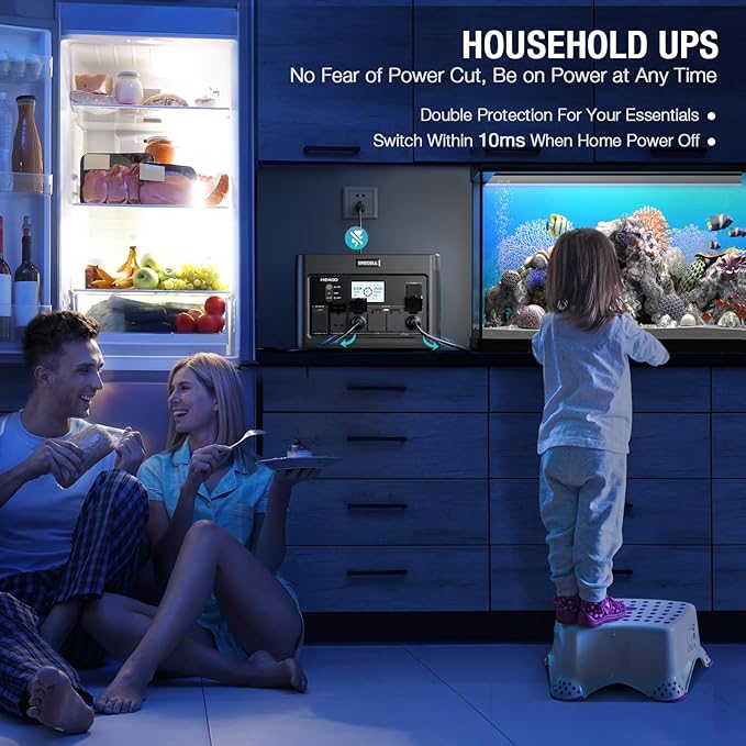 - UPS Mode Double Protection: A standby UPS resorts to battery backup power in the event of common power problems such as a blackout, voltage sag, or voltage surge. Connect the product between the wall outlet and devices, when there is a sudden power failure, our power station will automatically switch to the UPS power supply mode within 10ms, so as to keep safe working for the computer, refrigerator, bottle warmer, and other equipment below 1800W.