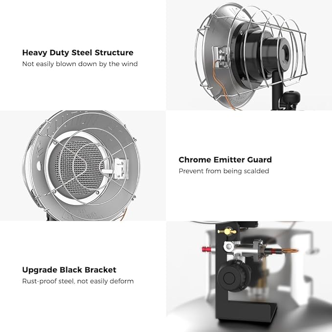 - 【Safey & Stability】--The gas heater with tip-over safety switch, accidental tip-over safety shut off the gas flow. Covered with a chrome emitter guard, greatly prevent you from being scalded accidentally.