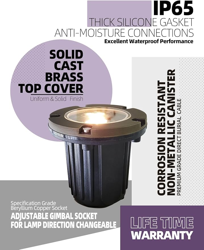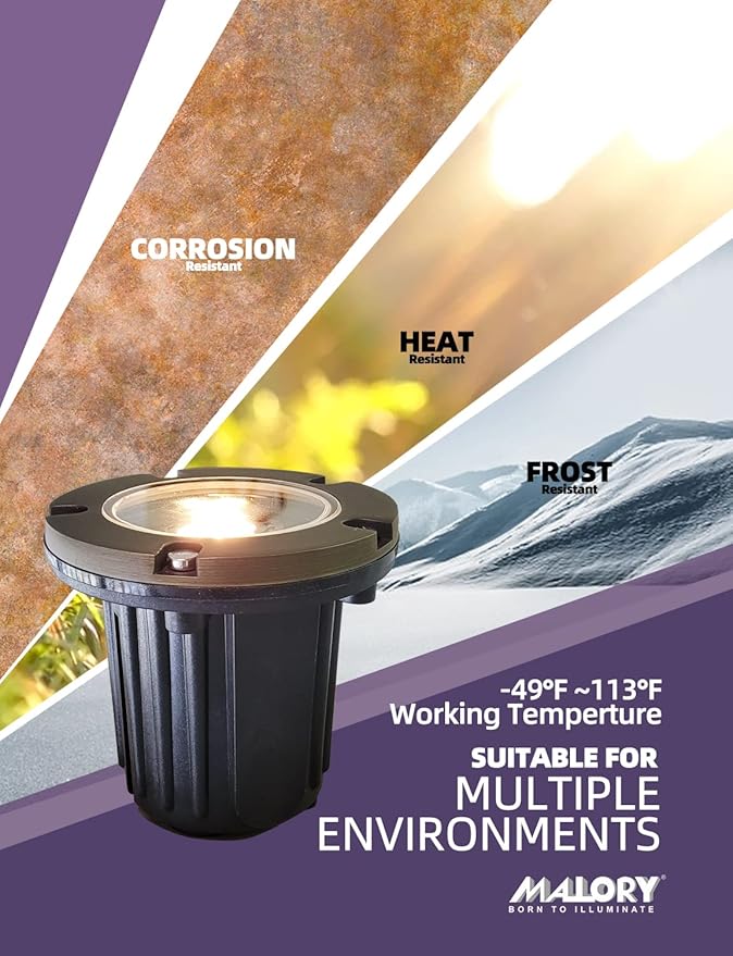- MALORY in-ground landscape lights are made of die-cast brass top and high quality PVC embedded part for any outdoor environment use. IP65 waterproof rating and -49℉⁓113℉ working temperture,without worrying about rain, snow, frost, high temperature, and other bad weather.