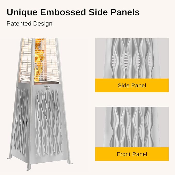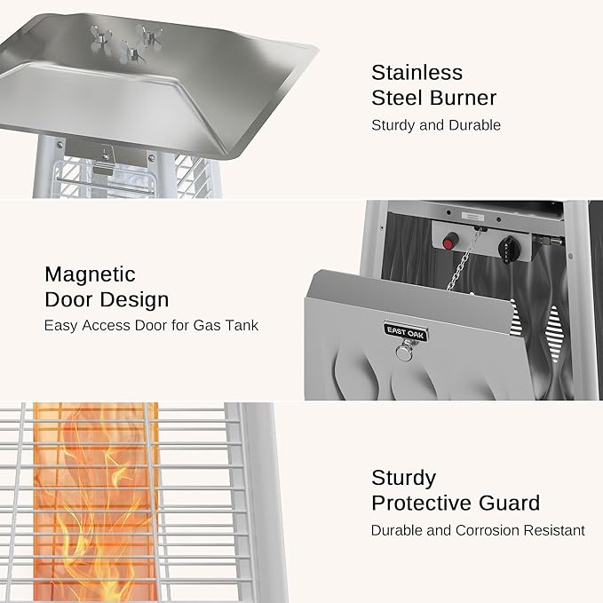- ๐จ๐ป๐ถ๐พ๐๐ฒ ๐๐บ๐ฏ๐ผ๐๐๐ฒ๐ฑ ๐ฃ๐ฎ๐๐ฒ๐ป๐ ๐๐ฒ๐๐ถ๐ด๐ป : Our team poured a lot of heart and soul into the design of the EAST OAK Pyramid Patio Heater, and we're pleased to offer the design in four stainless steel surfaces embossed, a pyramid shape to create a beautiful and elegant outlook, burning flame helps you enjoy the outdoor living.