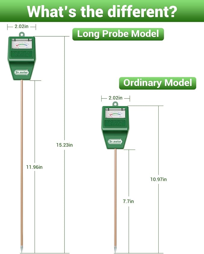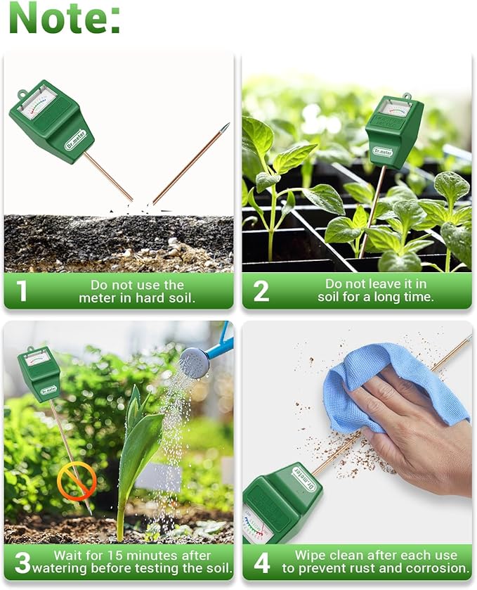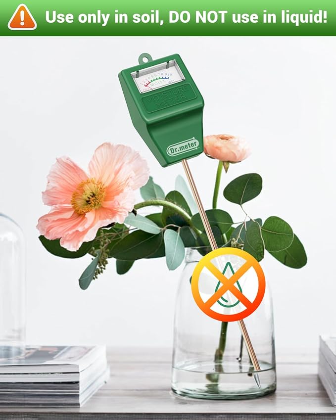 - Helpful Tips: The Dr.meter Soil Moisture Sensor Meter is designed only for soil testing and should not be used in liquids. Keep it away from rocks and extremely hard soil to avoid damaging it. Make sure to clean the probe after each use