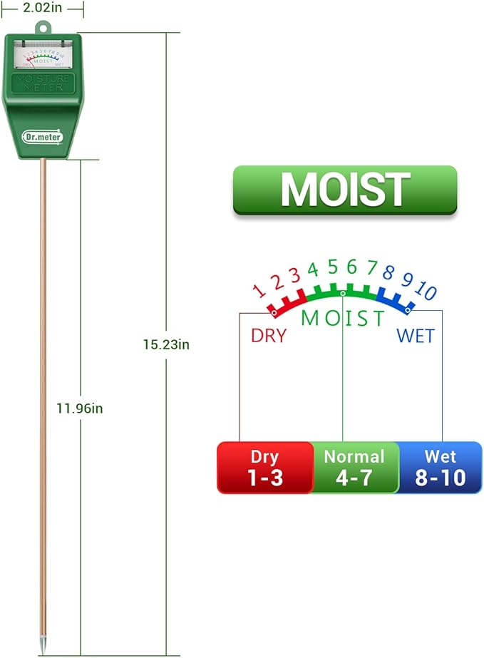 - Compact & Portable: Have you been sticking your finger in the soil hoping to feel when it's time to water? Why not eliminate the guesswork and keep your hands clean when you use the Dr.meter Soil Moisture Sensor Meter! Know the right time to water your garden, farm, lawn and plants, anytime