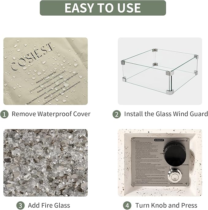 - 🔥 【 Transparent Gray Fire Glass 】: Transparent Gray fire glass pieces fill the burner bowl and adds a different color to this fire table. No soot or ash to clean up and no smoke as with wood burning or charcoal. Clean burning propane stays lit with no smoking and is better for the environment. The unit comes with a heavy duty waterproof cover to keep it clean and dry when not in use. Built-in side handles for easily moving. Wind guard and waterproof cover for protecting.