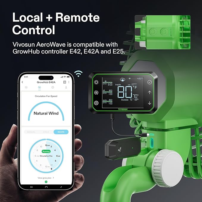 - Smart Wi-Fi Control: The AeroWave E6 is compatible with the Vivosun Grow Hub E42/E42A/E25, to remotely control speed and ON/OFF timer settings; You can connect this device to the SGS to have the device synch with your grow recipes and to operate in tandem with other smart devices