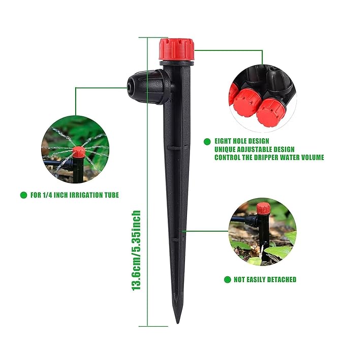 - Packeage including :Set of 12pcs Drip Emitters 13 pcs Garden Drippers Sprayer for 1/4" Drip Irrigation Tubing, featuring Adjustable 360 Degree Red Water Flow Drippers on 5.35" Arrow Stake .5.5"Blue Drippers Sprayer . Perfect for Garden Irrigation with (4-7mm) Watering System. Products are available in spray diameters from 0 to 10 feet.