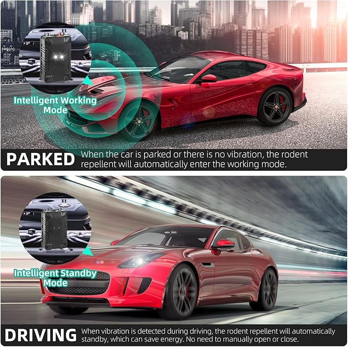 - Humanized Repeller & No Harm to Pets: This vehicle ultrasonic car mouse repellent has power on self check and vibration detection functions, which can effectively prevent rodents such as mice and squirrels from invading your car while not harming your pet. The ultrasonic mouse repeller will turn off when it senses motion and has a safety switch that will not exhaust the battery. In short, this car's mouse drive is practical and easy to install, making it an ideal choice for protecting your car.