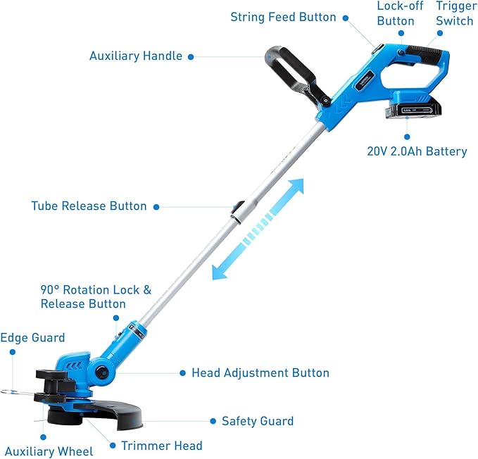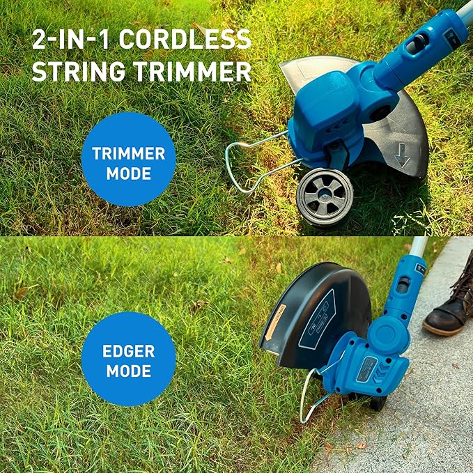 - [2-IN-1 Trimmer & Edger]: WISETOOL weed wacker can easily convert from a string trimmer to a wheel edger in just seconds, save yourself the expense of buying a separate edger. Retractable string trimmer with 180°-Rotation handle can provide you a very comfortable working environment. And the head pivots 90° easy to deal with hard-to-reach areas including clipping on slopes