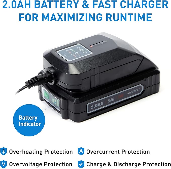 - [Long Lasting & Fast charging]: We will provide a complete set of working equipment, you do not need to extra purchase. The included 2x 2.0ah 20v battery could support for 1 hour. Also applicable to other WISETOOL cordless tools