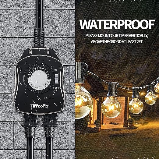 TiFFCOFiO Outdoor Timer Outlet for Lights, 24 Hour Mechanical, Outdoor Light Timer Waterproof, 2 Grounded Outlets for Home and Garden, 15A 1/2HP, Heavy Duty, CSA Listed (2 Pack)