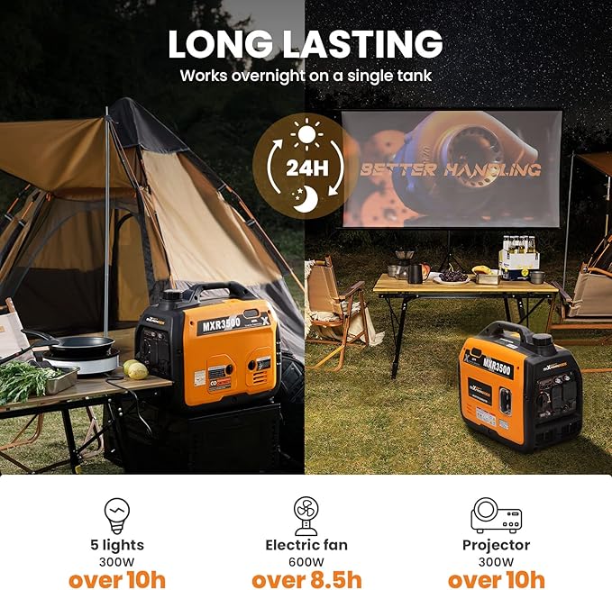 - 【Multifunction Power Supplier】 Quiet and fuel efficient 4 stroke 144cc generator produces 3400 watt max watts and 3000 watt running watts and up to 8 hours run time. Perfect for outdoor camping, outdoor party, garden courtyard, outdoor wedding, RV travel, emergency use of family power failure in extreme weather, etc.