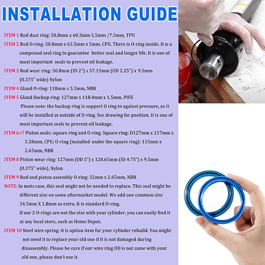- Superior materials] Ezbzyz 5.0" Bore X 2.0" Rod Hydraulic Log Splitter Cylinder Rebuild Seal Kit made of rubber, plastic and steel, rubber can make the seal ring not easy to age, plastic material plastic ring makes the product tougher Not easy to break.