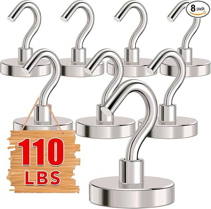 - STRONG PULLING FORCE: Our strong magnets with hooks are made of powerful neodymium magnets, which can reach 110 lbs horizontally and 36 lbs vertically. All magnetic grill hooks are designed to be heavy duty magnets hooks, ensuring reliable hanging