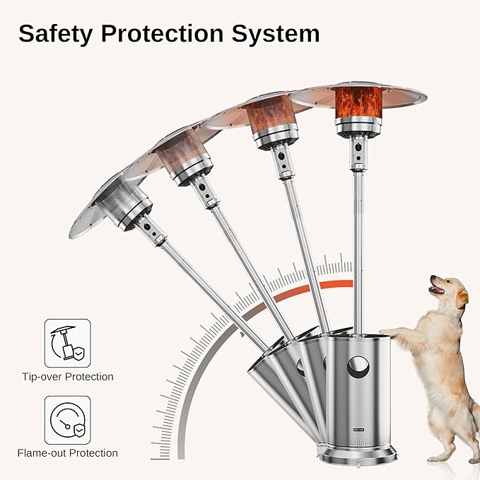 - ๐ฆ๐ฎ๐ณ๐ฒ๐๐ ๐ฃ๐ฟ๐ผ๐๐ฒ๐ฐ๐๐ถ๐ผ๐ป ๐ฆ๐๐๐๐ฒ๐บ: The Tip-over Protection system will shut off the flame when the patio heater propane is tilted more than 45 degrees. If the flame goes out, the Flame-out Protection system automatically shuts off the gas supply