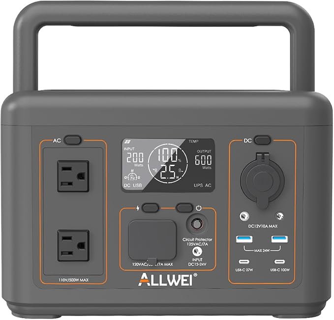 - 【Power All Loads for the Road】 ALLWEI 512Wh generator has everything you need in one unit, with 500W AC outlets*2, 1*USB-C100W, 1*USB-C 27W, 2*USB-A, 2*DC 5521, 1*car port to power all essentials you need.