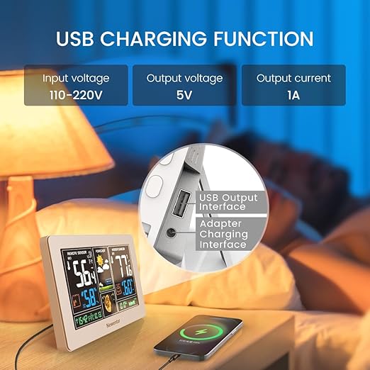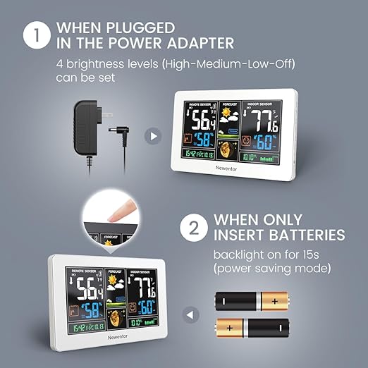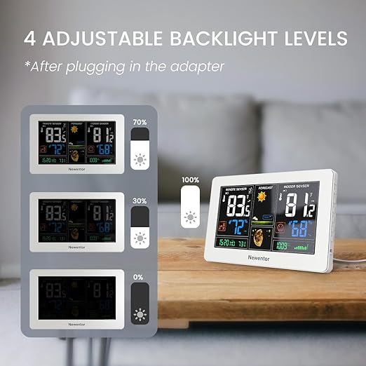 - [7.5" LCD Screen Weather Stations] Newentor temperature&humidity monitor with large color display, which shows comprehensive information: inside outside temperature humidity(max/min, hi/lo), customizable alerts, time/date, alarm clock/snooze, weather forecast (next 8-24 hrs) moon phase, barometric pressure.
