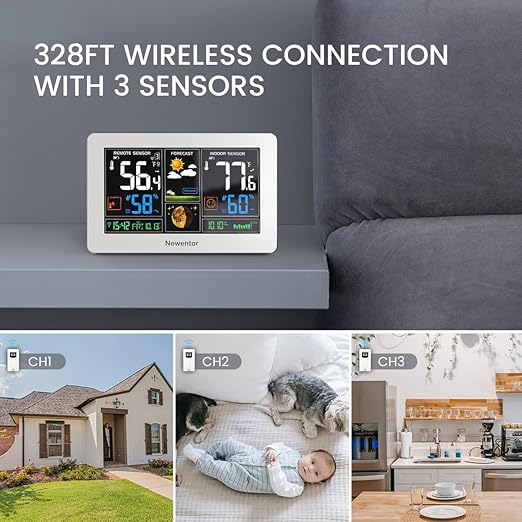Newentor Weather Station Wireless Indoor Outdoor Thermometer, Color Display Digital Weather Thermometer with Atomic Clock, Barometric Pressure, Forecast Station with Adjustable Backlight,White,3Sensor